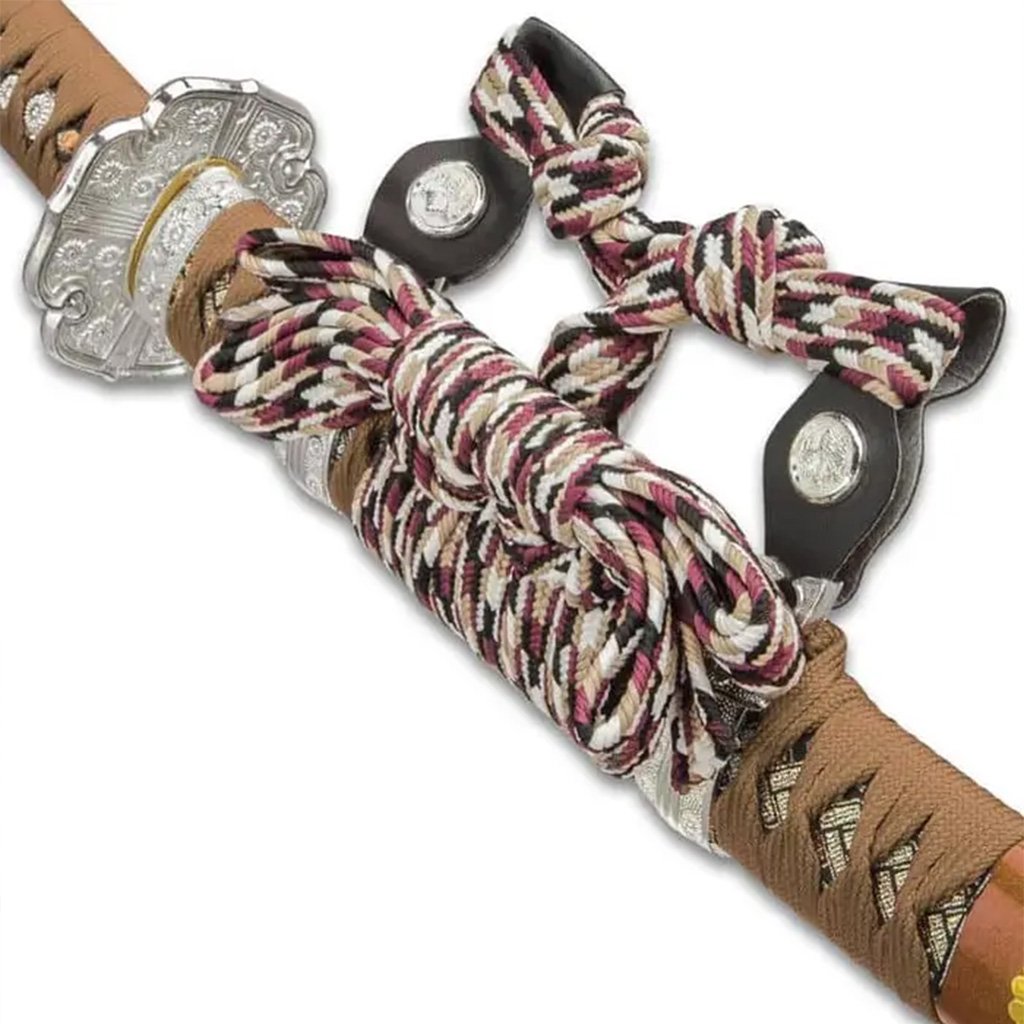 - Hand-lacquered saya every bit as impressive as the sword it protects – traditional genuine leather cavalry hanging hardware, a.k.a. “ashi” and “obi tori”; cast medallions, insignia accents; elaborate