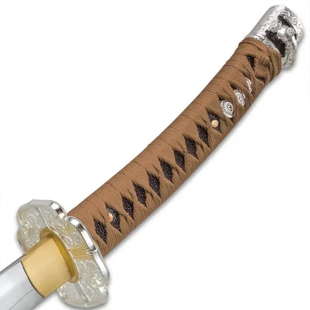 - Flawlessly cast tsuba, kashira, fuchi, menuki accented with delicate, beautiful reliefs; hardwood tsuka wrapped in traditional braided ito that extends beyond tsuka onto saya
